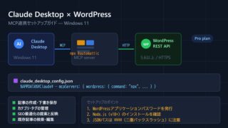 AIアシスタント「Claude」をWordPressと連携させると、記事の作成・編集・管理をAIが直接操作できるようになります。その架け橋となるのがMCP(Model Context Protocol)です。本記事では、Windows 11...