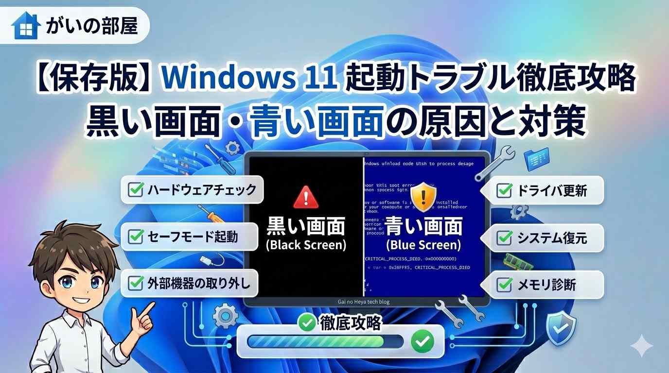 - 根本解決: セーフモードで起動し、「デバイスマネージャー」から問題のあるドライバ(警告マーク付き)を特定・ロールバックします。