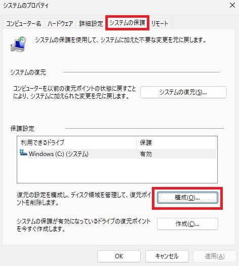 - コントロールパネル → システム → システムの保護 → 保護設定を「有効」にする