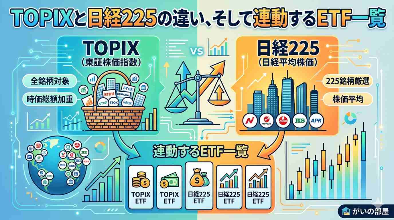 TOPIXと日経225は、どちらも日本株式市場を代表する株価指数ですが、構成や算出方法に大きな違いがあります。本記事では両指数の違いと、それぞれに連動する主要なETFをまとめてご紹介します。