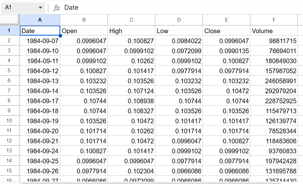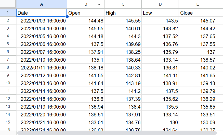 =QUERY(GOOGLEFINANCE("NASDAQ:AAPL", "all", DATE(2022,1,1), TODAY(), "DAILY"),"select Col1,Col2,Col3,Col4,Col5")