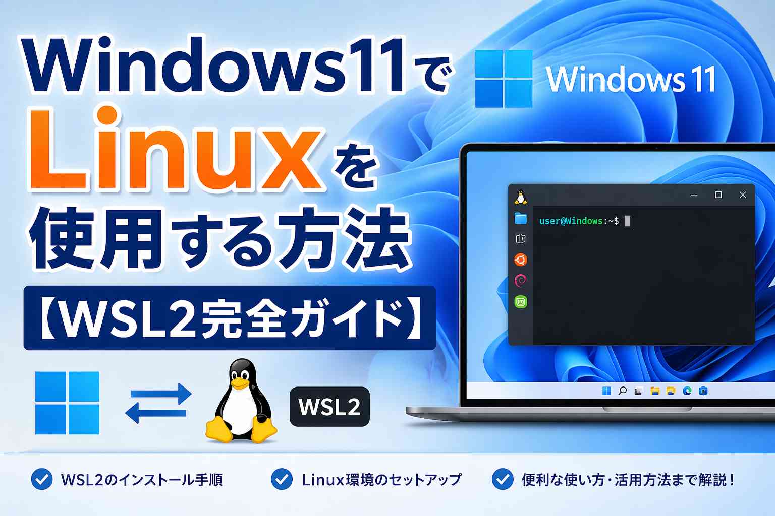 Windows 11のWSL2を使えば、仮想マシンなしで本格的なLinux環境をWindows上に構築できます。開発環境としてはもちろん、LinuxコマンドやシェルスクリプトをWindowsで学ぶ用途にも最適です。ぜひ試してみてください!