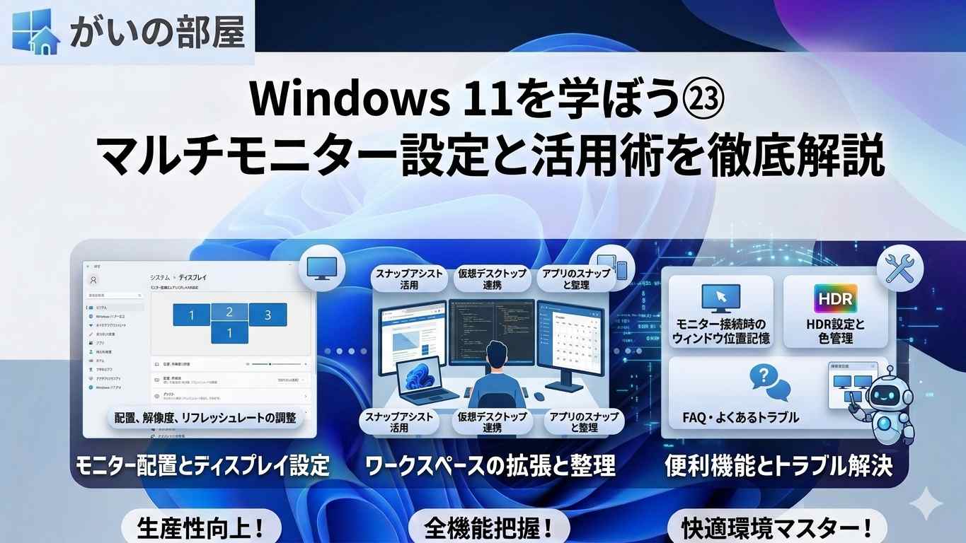 複数のモニターを接続するマルチモニター環境は、作業領域を大幅に拡張して生産性を高める強力な手段です。Windows 11 はマルチモニター向けの設定が大幅に整備され、解像度・リフレッシュレート・ HDR などをモニターごとに細かく設定できます。この記事では、接続方法から高度な活用術まで徹底解説します。
