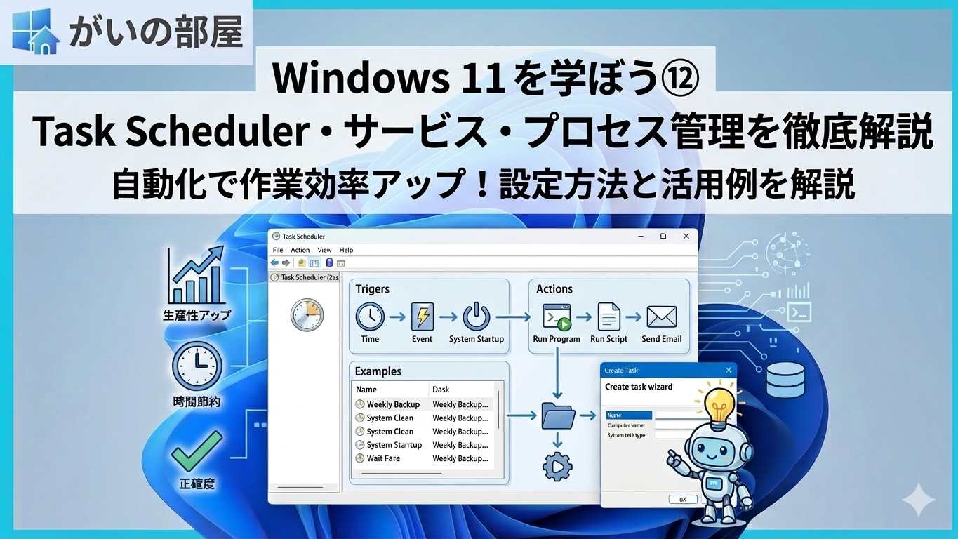 Windows 11の裏側では、目に見えないところで無数のプログラムが動き続けています。セキュリティスキャン、自動バックアップ、システム更新の確認など、これらはすべて「サービス」「タスクスケジューラー」「プロセス」という仕組みによって動いています。
